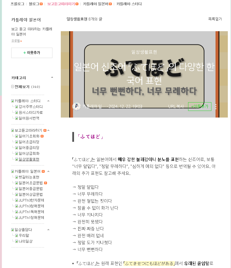 블로그 주인의 열정과 노력이 담긴 이 블로그는 단순히 학습 자료를 제공하는 것에 그치지 않고, 학습자들이 실제로 일본어를 사용하는 데 필요한 실용적인 팁과 전략도 제공합니다. 예를 들어, 일본어 회화에서 자주 사용되는 표현들을 소개하고, 실제 상황에서의 대화 예시를 통해 학습자들이 자연스럽게 일본어를 익힐 수 있도록 돕습니다. 또한, JLPT 시험 준비를 위한 모의 시험 문제와 해설도 제공하여, 학습자들이 시험에 대한 자신감을 가질 수 있도록 합니다.
