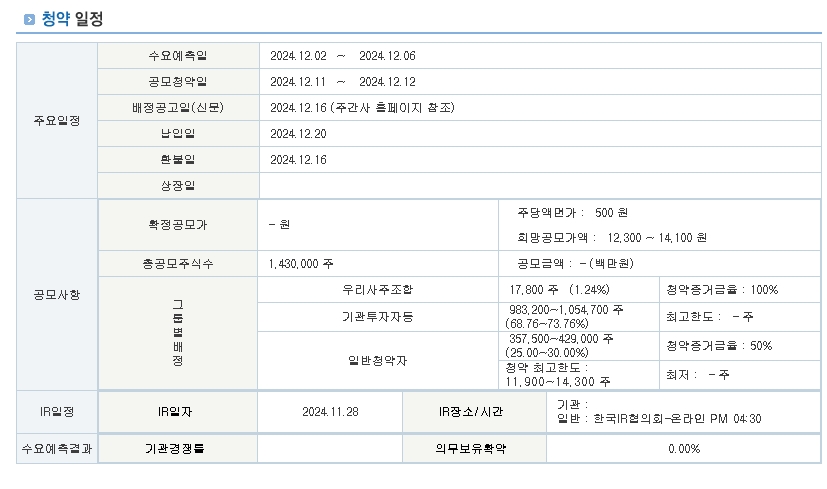- 청약일: 2024년 12월 11일 ~ 2024년 12월 12일