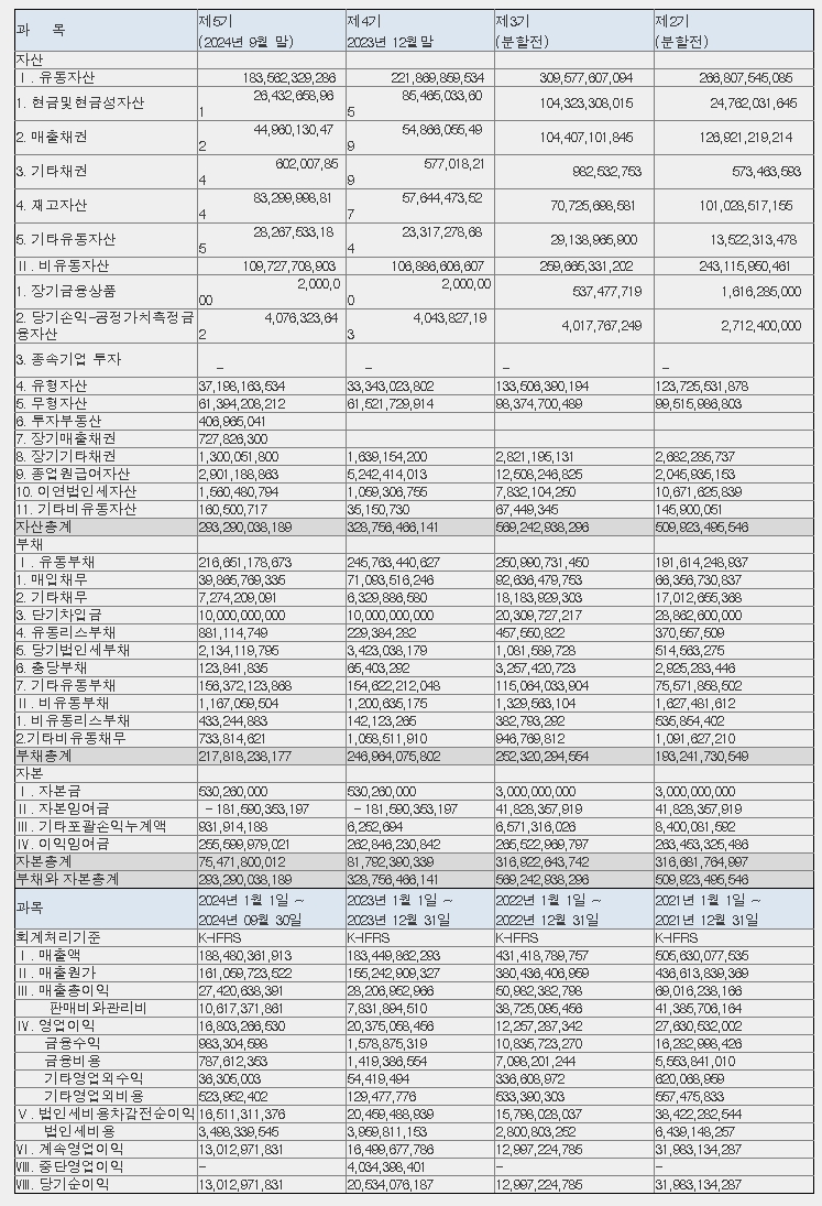엠앤씨솔루션의 최근 재무 현황을 살펴보면, 2023년 3분기 기준으로 매출액은 188,481백만 원, 영업이익은 16,803백만 원, 당기순이익은 13,013백만 원을 기록했습니다. 이는 전년 동기 대비 큰 폭으로 증가한 수치로, 회사의 성장 가능성을 보여줍니다.