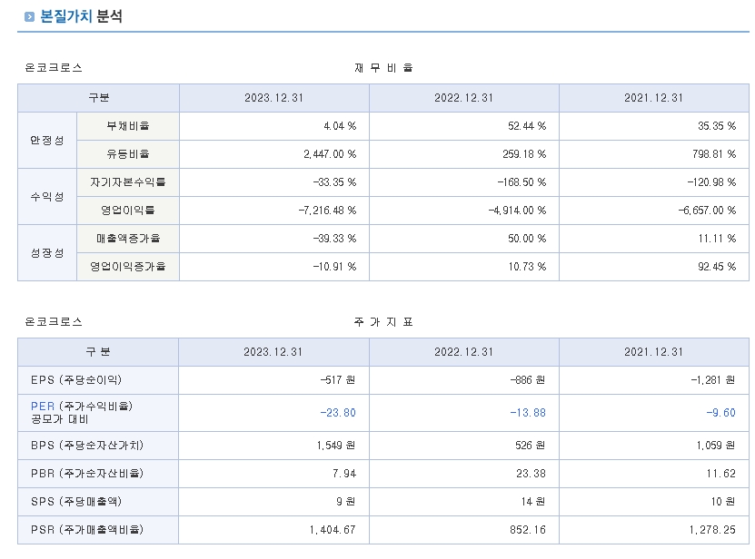 - 재무 안정성: 온코크로스는 안정적인 재무 구조를 가지고 있으며, 최근 몇 년간 꾸준한 매출 성장을 기록하고 있습니다.
